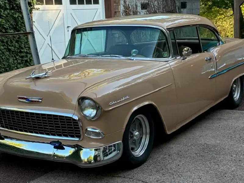 55 ‘210’ 2 dr HT Navaho Tan, Interior Beige & Brown. Interior mostly stock except front bucket seats. 305 small block 600 cfm Holley, 5 speed Stick not overdrive 10 bolt 70s rear, 4 wheel power Disc brakes. Wheels; American Salt lake slots. 6” front 7” rear. Drop spindles. UD AC. Stock steering box with original style power assist. Was repainted in Urethane around 2001. Car has been indoors ever since. Car came from Arkansas restored by a good guy from Missouri. Body off paint on underneath is still there. Driven rarely in the last decade or so. Recently replaced the gas tank fuel pump & tank line because of that. Am Fm radio with CD player in trunk. I have owned the car since 1985. All chrome is very good. Call or email if interested. $25,500.